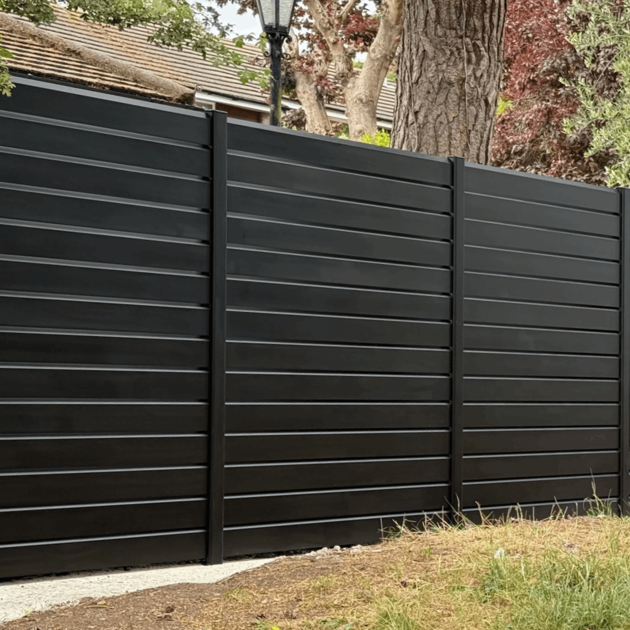 Each infill slat is 112mm x 25mm and is made of 1.6mm thick aluminium walls. Each of our fencing panels are carefully cut in the UK to your measurements..