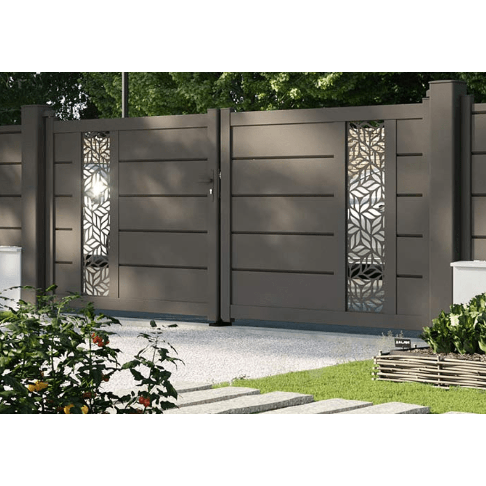 This double leaf swing gate with laser decorative aluminium panel and horizontal slats is a charm to any driveway. Transform your driveway with the sleek elegance of the Fresk collection by Kostum