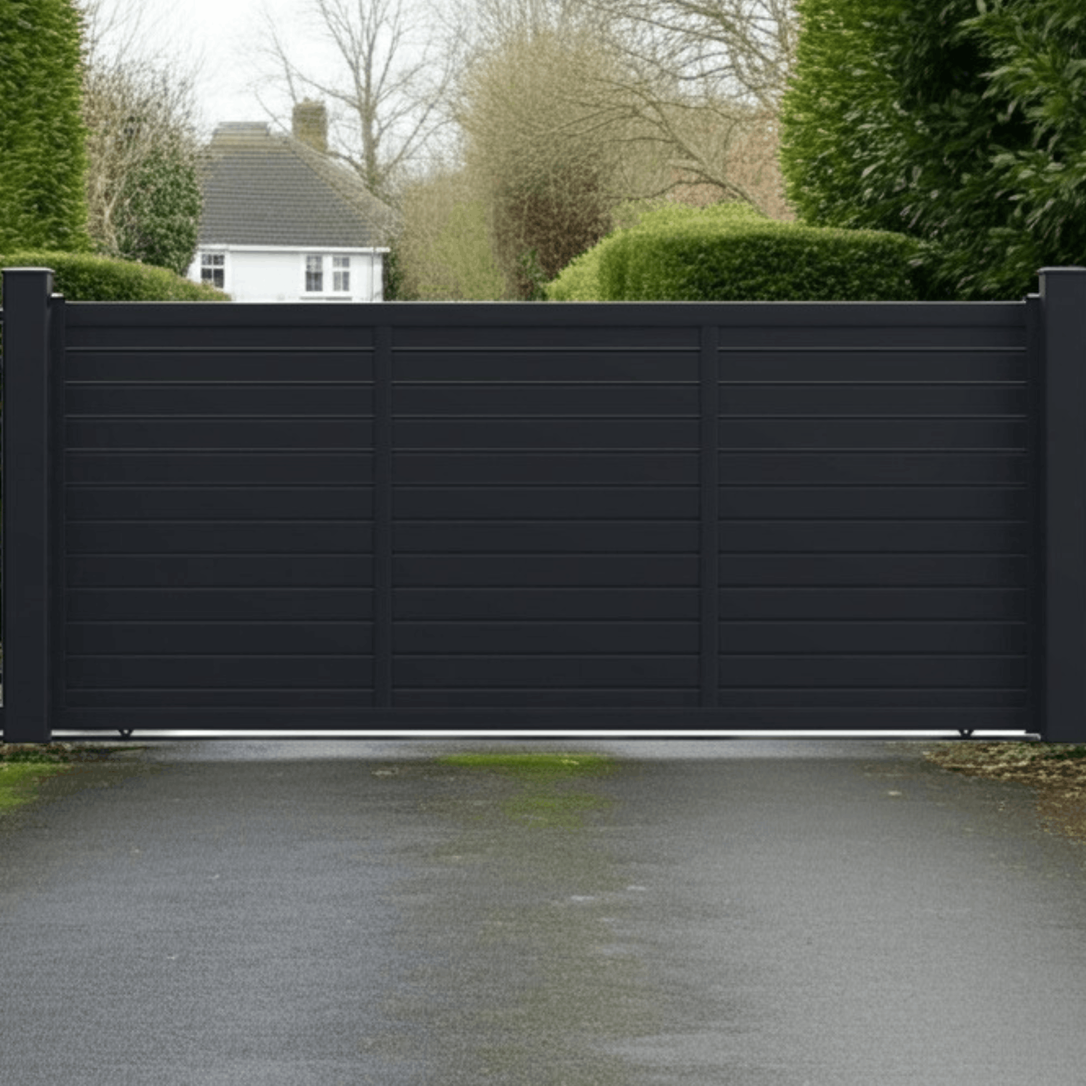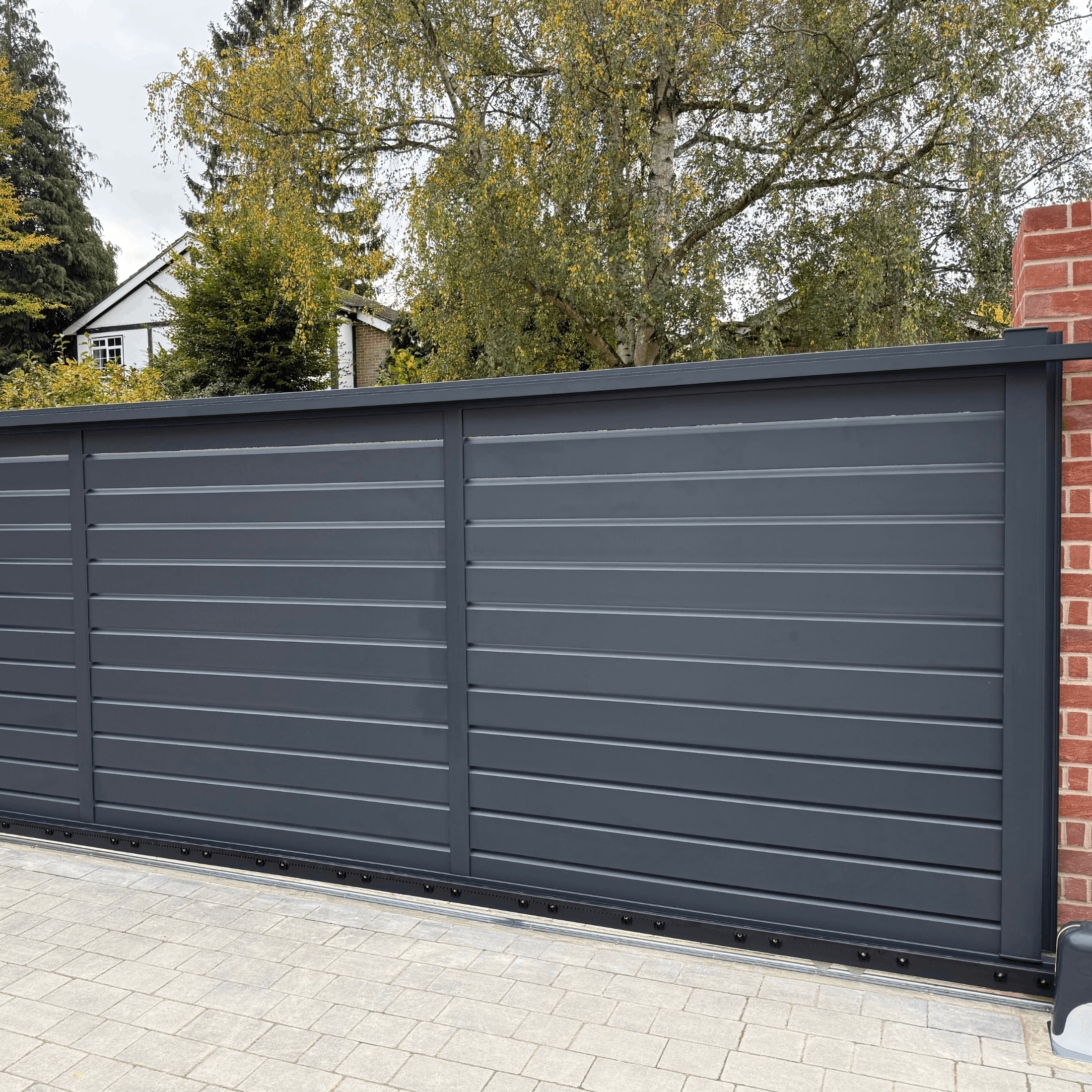 Durable sliding gate made of louvred horizontal slats. Made of Aluminium, Leon sliding gate from SLAB adds privacy to your front garden and is specially designed for wind prone area. For ease of access, why not automate your gates by adding sliding gate automation kit ?